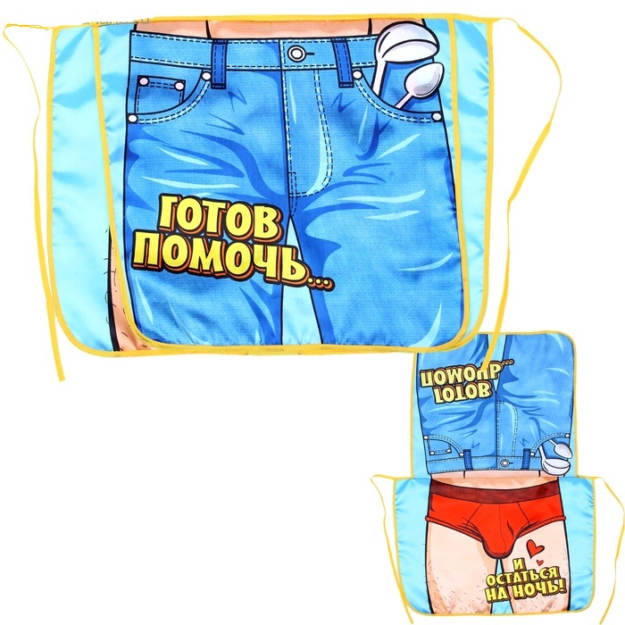 У таких фартуков есть своя изюминка — они двуслойные. Например надпись на мужском фартуке- «Готов помочь» продолжает тайная надпись … «и остаться на ночь!» Необычно)