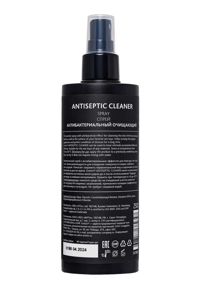Антибактериальный очищающий спрей подходит для различных сфер жизни. Рекомендуется к использованию для очищения поверхности секс-игрушек. Он помогает сохранить первоначальный вид и идеальное состояние девайсов на долгое время. Подходит для ухода за игрушками из любого материала до и после их использования. Также его можно использовать как средство для кожи с антибактериальным эффектом. Для наилучшего эффекта помойте игрушку водой, а затем нанесите Anticeptic Cleaner от Erotist®. Промокните излишки салфеткой или дайте высохнуть на воздухе. Для антибактериальной защиты кожи нанесите на очищаемый участок и равномерно распределите.