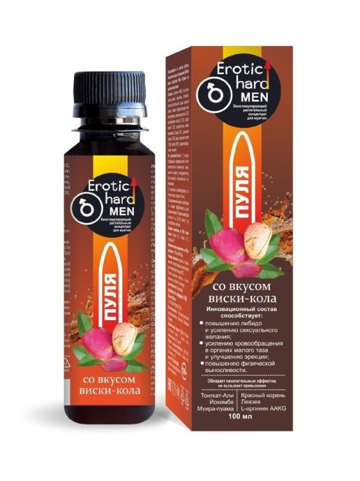 ЗакрытьБиостимулирующий растительный жидкий концентрат Erotic hard Man ''Пуля со вкусом виски-кола разработан специально для мужчин. За счет натуральных растительных компонентов в составе, Erotic hard Man ''Пуля оказывает положительный эффект на работу всех основных систем организма. А мощные природные афродизиаки, усиленные L-аргинином AAKG, благотворно воздействуют на половую функцию.