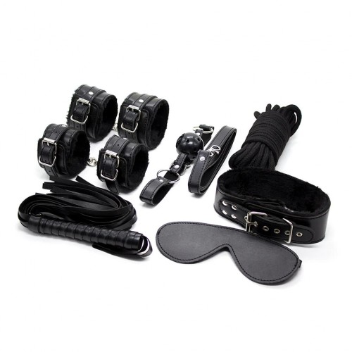 Комплектация: маска на глаза, наручники, поножи, ошейник, поводок, кляп, плеть, веревка для связывания