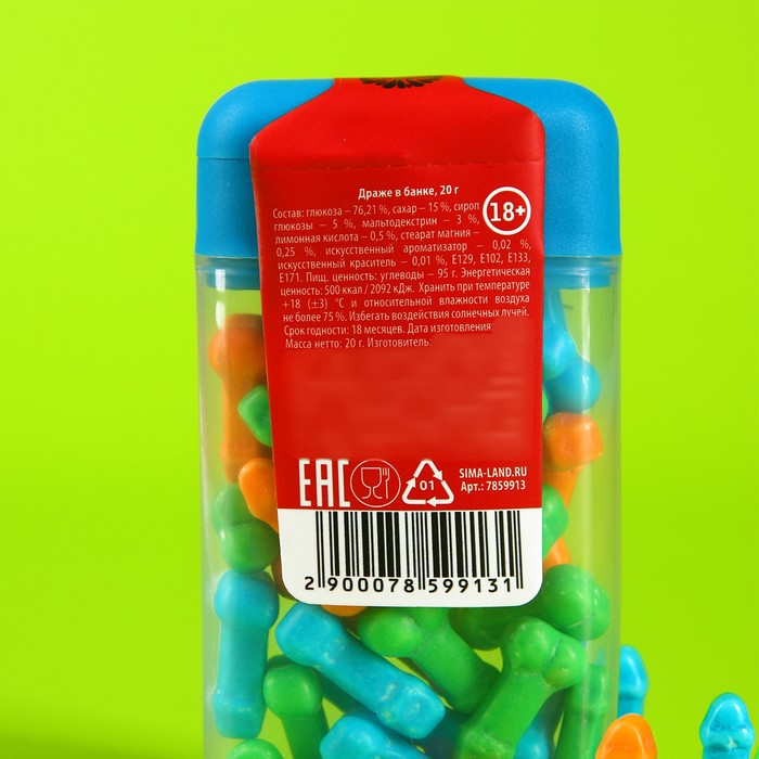 Состав: глюкоза 76,21 %, сахар 15 %, сироп глюкозы 5 %, мальтодекстрин 3 %, лимонная кислота 0,5 %, стеарат магния 0,25 %, искусственный ароматизатор 0,02 %, искусственный краситель 0,01 %, Е129, Е102, Е133, Е171