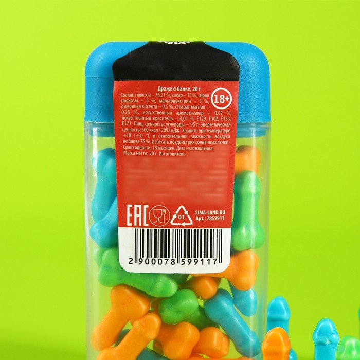 Состав: глюкоза 76,21 %, сахар 15 %, сироп глюкозы 5 %, мальтодекстрин 3 %, лимонная кислота 0,5 %, стеарат магния 0,25 %, искусственный ароматизатор 0,02 %, искусственный краситель 0,01 %, Е129, Е102, Е133, Е171