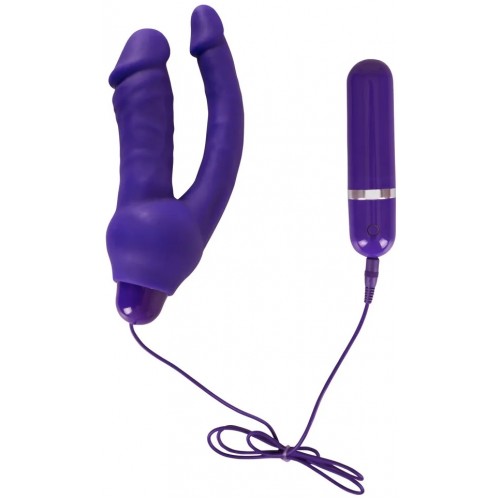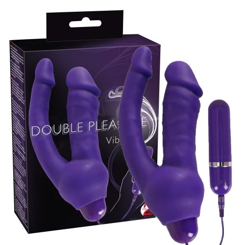 Двойной вибратор фиолетового цвета Double Pleasure Вибратор с двумя фаллосами предназначен для одновременной анально-вагинальной стимуляции. Классический размер и форма позволяют использовать интимную игрушку с комфортом.