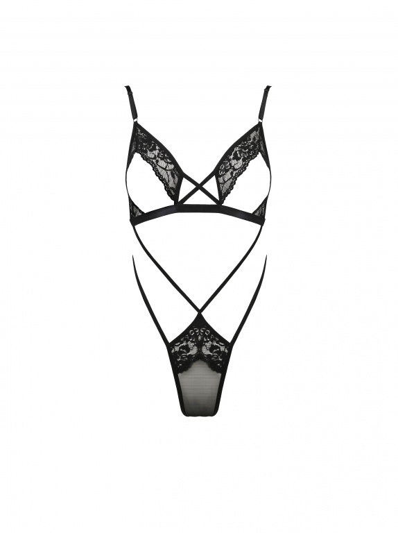 Сексуально привлекательное боди черного цвета выполнено из эластичного материала в виде кружева и стреп-лент.