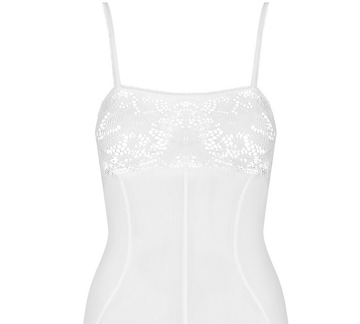 Смелое сочетание чулок с топом. Белая сеточка чувственно окутывает тело. Цветочный узор украшает верхнюю часть чулок и топа. Вертикальные полоски зрительно удлиняют тело. Пикантные вырезы открывают бедра и ягодицы.