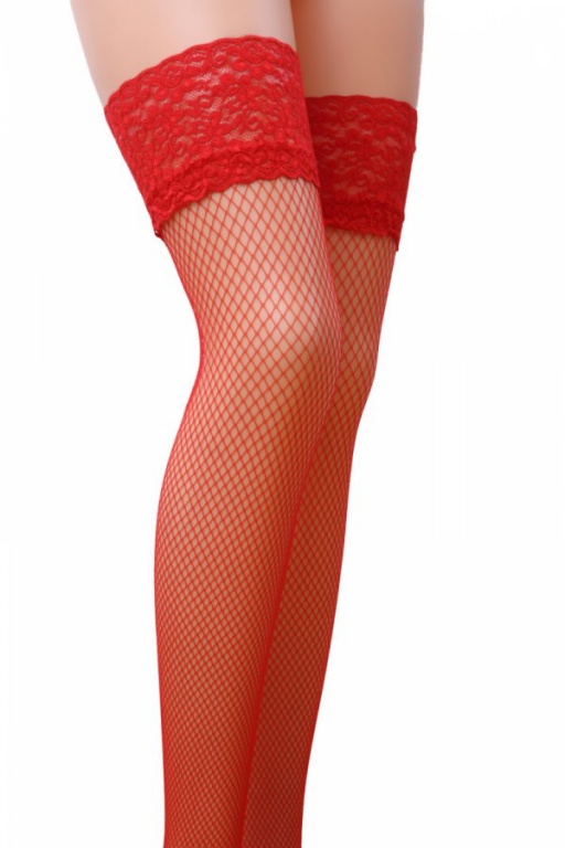 Чулки красные в мелкую сетку с кружевным верхом, на силиконе. Размер S