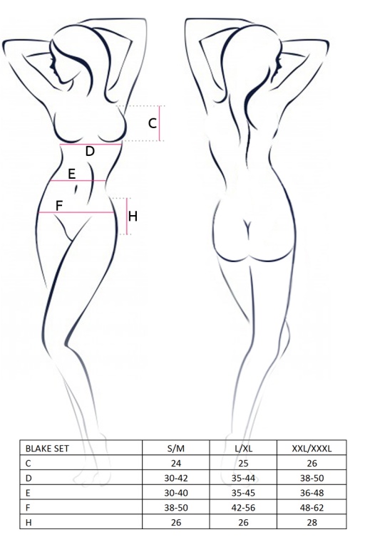 Чувственный комплект выполнен из черной микрофибры и эластичного тюля, отделанный тонким кружевом. Лиф-халтер сзади застегиваетяс на 2 крючочка, имеется 2 ряда петелек для регулирования объема. Длина бретелек регулируется. Широкий пояс для чулок застегивается на крючочки, имеется 2 варианта объема. В комплект входят черные стринги. Размер L/XL.