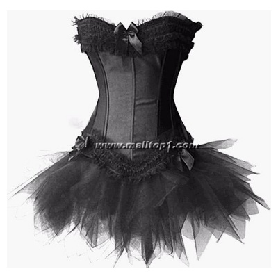 Чудесный черный комплектик состоит из трех предметов: корсета на косточках со шнуровкой, декорированного тремя бантиками и ажурными сборочками; пышной мини-юбочки и трусиков стринг.