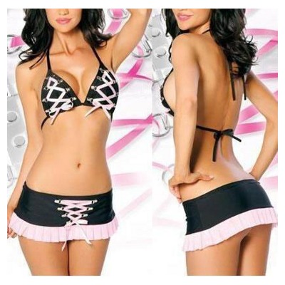 Сверху – купальный лифчик из треугольничков, украшенный толстой розовой шнуровкой.