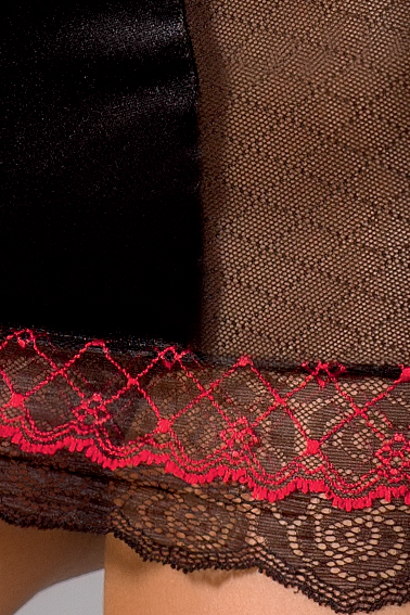Сексуальная сорочка черного цвета с сетчатыми вставками. Лиф на косточках украшен цветочным кружевом и маленькими бантиками. Бретели регулируются по длине. Низ сорочки, так же, украшен кружевом. Выполнена из испанского сатина, тюля и итальянского кружева. Размер S/M.
