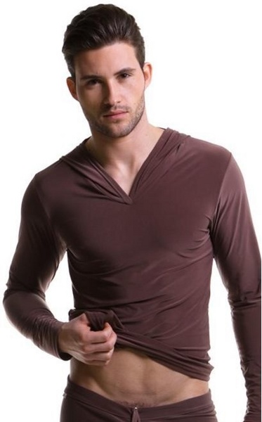 Изящная и оригинальная футболка для занятия спортом или йогой. Вырез V-образный и капюшон создадут образ стильного мужчины, а за счет легкого материала будет виден каждый рельеф спортивного тела. Прекрасно держит цвет.