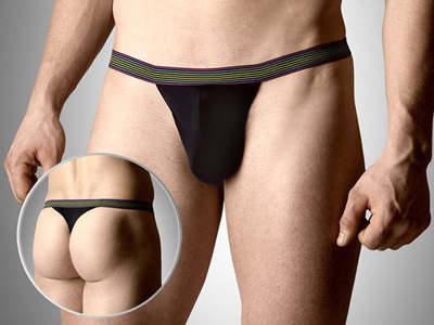 Необычная полосатая резинка этих черных стрингов словно гипнотизирует взгляд своими радужными переливами.