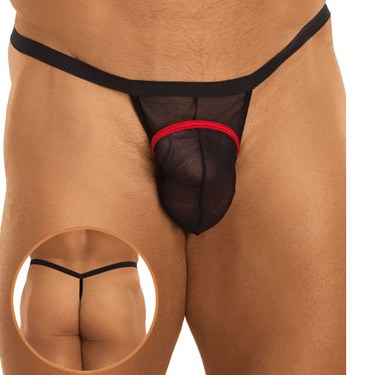 Стринги для мужчин, которым нечего скрывать. Элегантный сетчатый мешочек, вызывающе обернутый красной атласной полоской, эротично укутывает мужское достоинство и бросает вызов настоящему порыву необузданных страстных желаний.