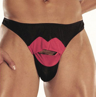 Классическая форма мужских трусов разбавляется принтом в виде женских губ и пикантным вырезом.
