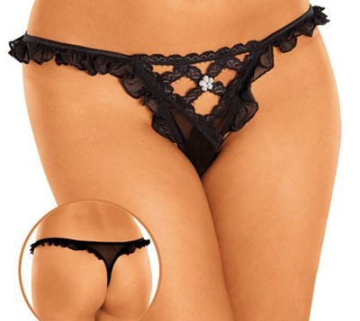 Миловидное очарование невесомых трусиков стринг – в легковесном обрамлении по краям легкими оборочками из полупрозрачного черного нейлона.
