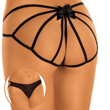 Обольстительный фасон черных трусиков стринг ошеломляет оригинальным исполнением – передняя часть представляет собой полупрозрачные узенькие трусики из тонкой сеточки с двойными лямочками от боков.