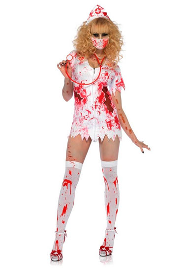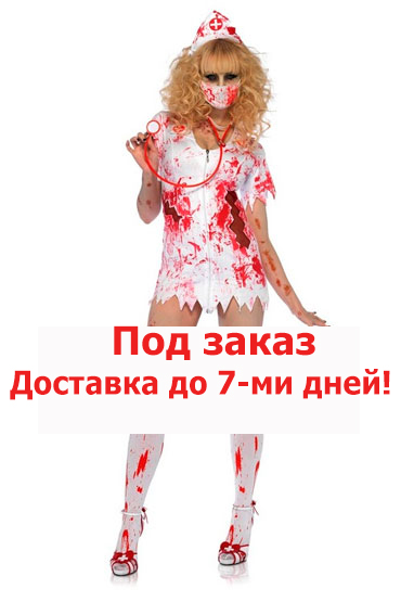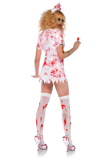 Состоит из 3-х предметов: "порванный" и "запачканный кровью" белый халатик на застежке-молнии, "запачканной кровью" медицинской маски, подходящего по стилю чепчика.