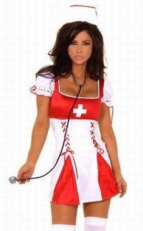 О чем хоть раз мечтал любой мужчина? О чувственных объятиях красавицы-медсестры, которая спасет его от всепоглощающей страсти. Короткое белое платье с вызывающими красными вставками, глубокое квадратное декольте, атрибутика.