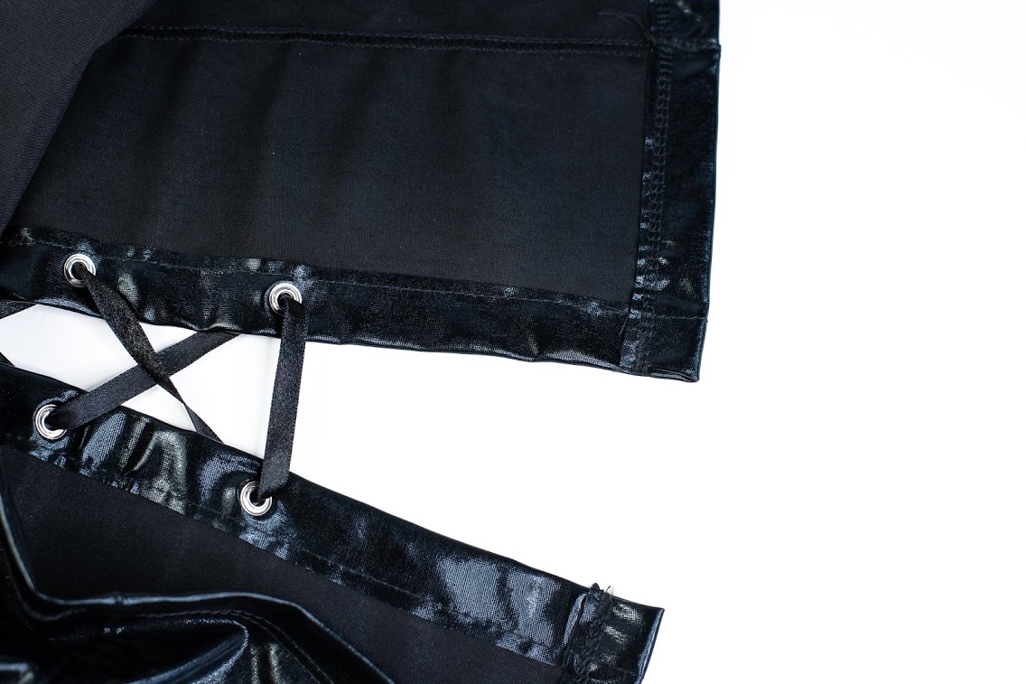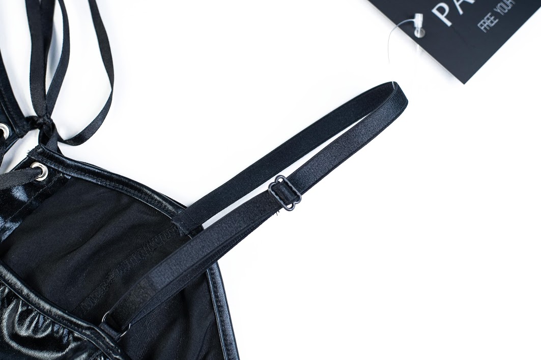 Сексуальная сорочка из эффектного блестящего винилового материала. Спинка сплошная, бретельки регулируются, шнуровка спереди по всей длине особенно идеально подчеркивает фигуру. Стринги идут также в комплекте. Размер S/M.