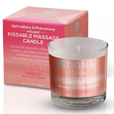 Массажная свеча Dona Kissable Massage Candle Vanilla Buttercream с ароматом ванили - необходимый атрибут романтического вечера. Нежное пламя и искрящийся оттенок создают эротический полумрак. Манящий аромат феромонов и афродизиаков витает в воздухе, пробуждая обоюдную неудержимую страсть. Все помещение наполняется теплым опьяняющим ароматом желания. Подождите немного пока растопится соевое масло, погасите пламя любви, и, на расстоянии от нежного тела, капните каплю волшебного тепла и начинайте массаж. Массажные движения должны быть чувственными: поглаживания, растирания, легкие похлопывания. После массажа кожа становится мягкой, шелковистой, обновленной и пропитанной жизненной энергией. Ваниль - сделает любые ласки сладкими, вызывая эйфорию и рождая сексуальные фантазии.