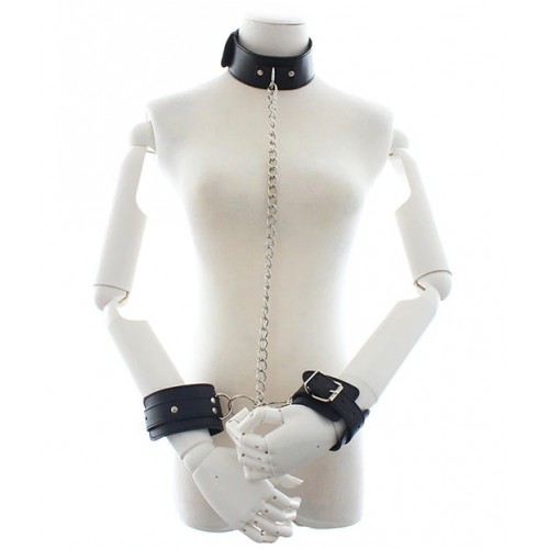 ЗакрытьБондаж чёрного цвета для рук с ошейником на цепочках