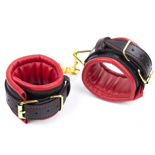 ЗакрытьЧерно-красные кожаные наручники с золотистой цепочкой