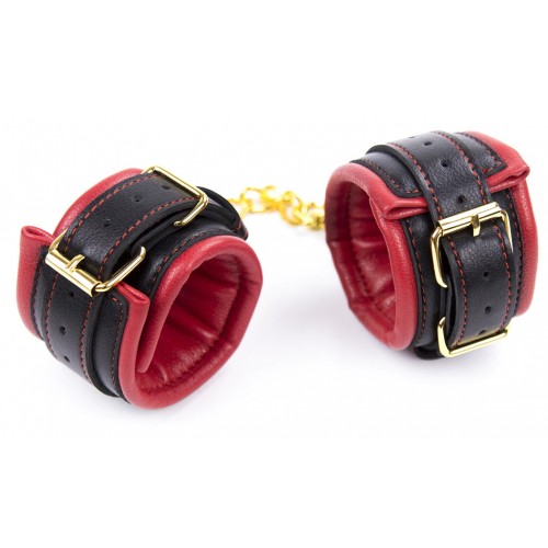 ЗакрытьЧерно-красные кожаные поножи с золотистой цепочкой