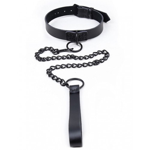 ЗакрытьЧерный БДСМ ошейник из натуральной кожи с черным поводком