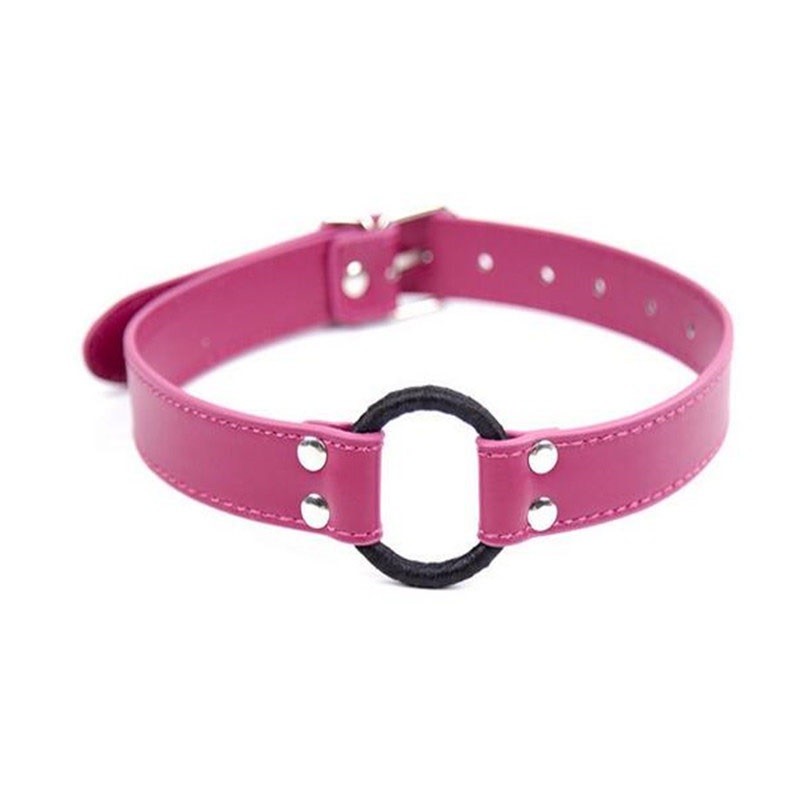 Кольцо держится на кожаных ремешках, которые крепятся на затылке, фиксируя кляп.