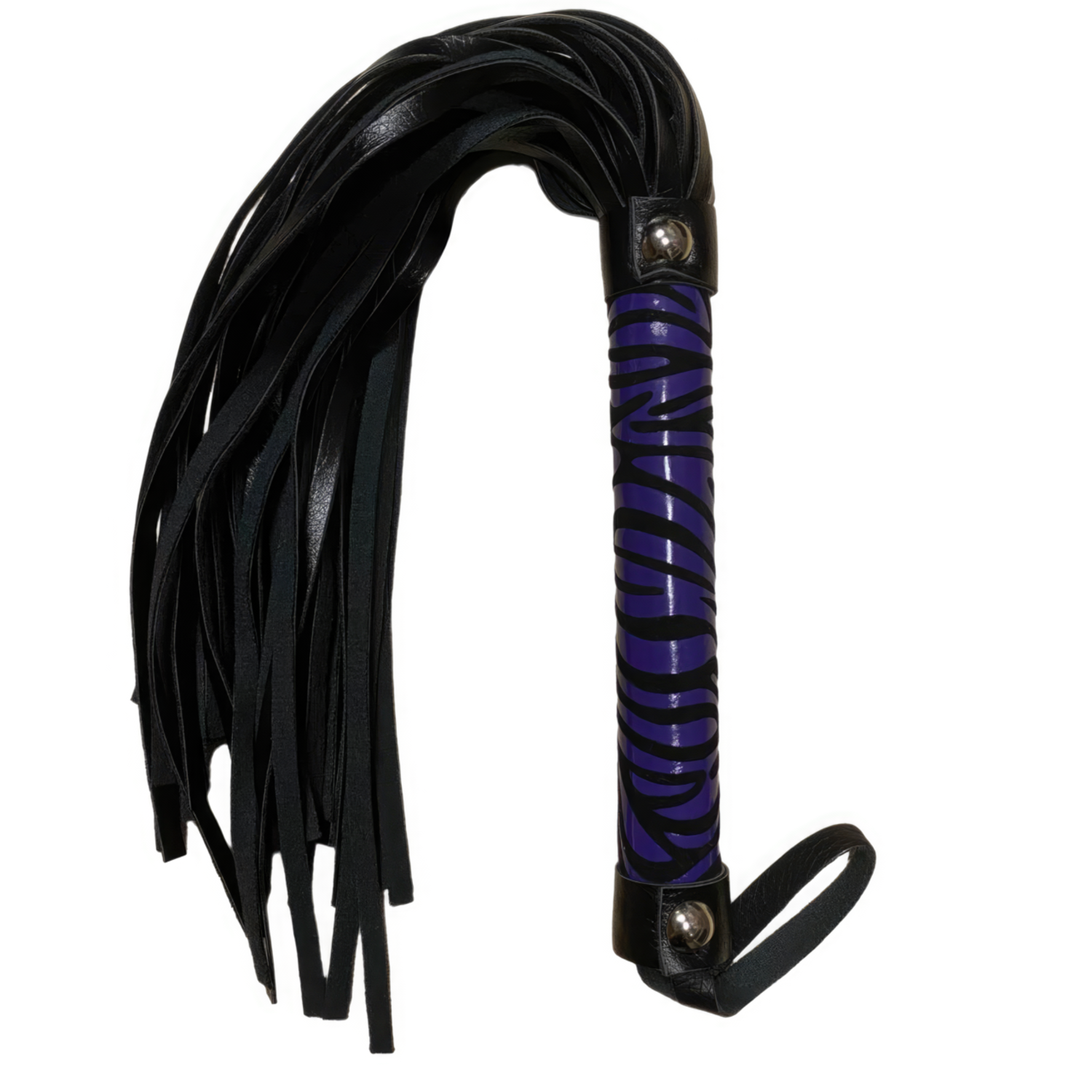 Ручка украшена черно-фиолетовым тигровым принтом, на конце имеется петелька для того, чтобы плеть удобно лежала в руке во время игр.