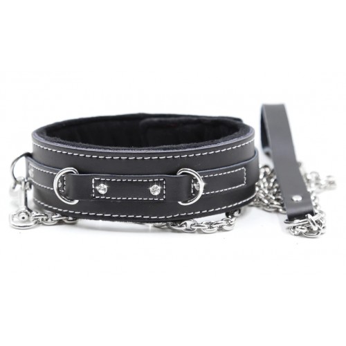 ЗакрытьКожаный черный ошейник со стразами и поводком