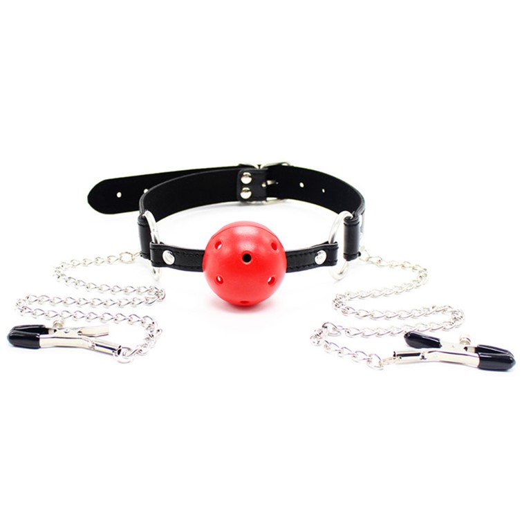 Кляп с зажимами для сосков на металлических цепочках послужит прекрасным дополнением для ролевых игр и БДСМ практик.