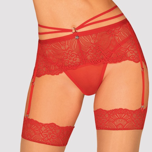 Роскошный кружевной красный пояс с 4 регулируемыми подвязками-пажами и ажурными трусиками необычайно сексуален и элегантно сидит на бедрах.