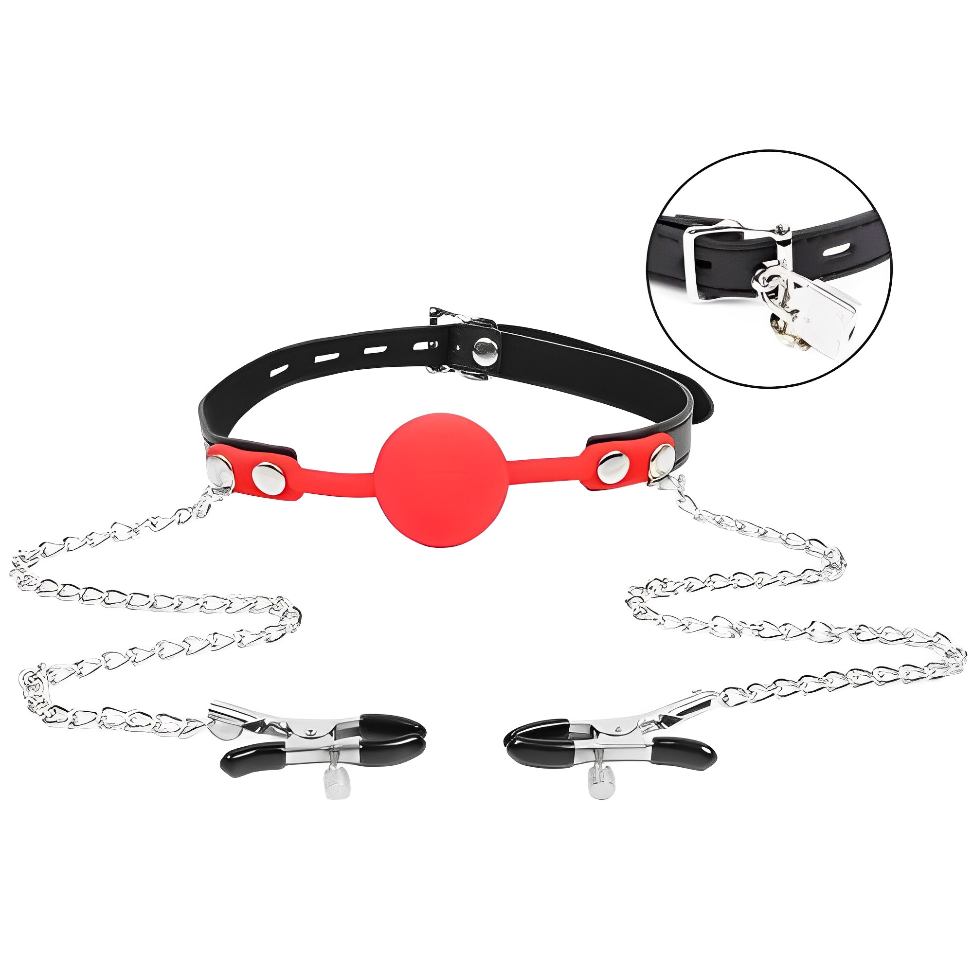ЗакрытьКрасный силиконовый кляп с зажимами для сосков и замочком