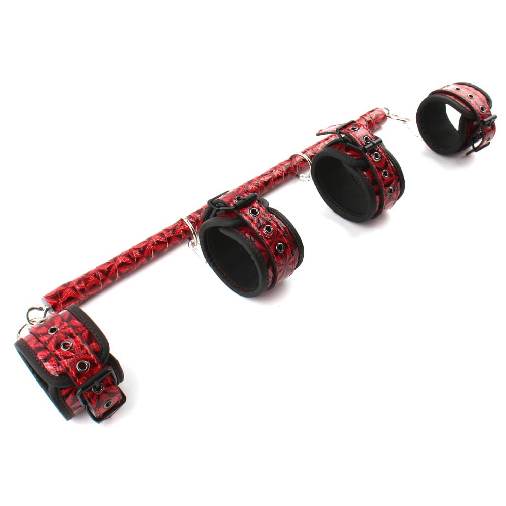 ЗакрытьЛакированная распорка красного цвета с наручниками и поножами