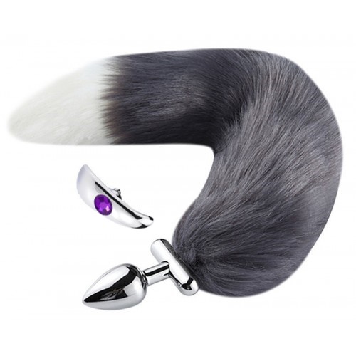 ЗакрытьМеталлическая анальная втулка со съемным серо-белым хвостиком и пробкой с фиолетовым кристаллом