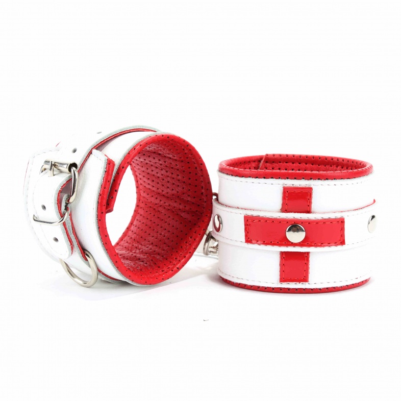 ЗакрытьОковы выполнены из натуральной кожи, декорированы для образа медсестры. Выполнены из белой гладкой кожи с ярко-красным лаковым крестиком, подклад из нежной красной кожи с перфорацией для максимально комфортного использования.Ширина оков 6см, ширина ремешков 2см. Подойдут на обхват от 17 до 28см. Металлическая пряжка надежно удерживает в подчинении, кожаное соединение с карабинами фиксирует оковы вместе, общая длина соединения 12см.