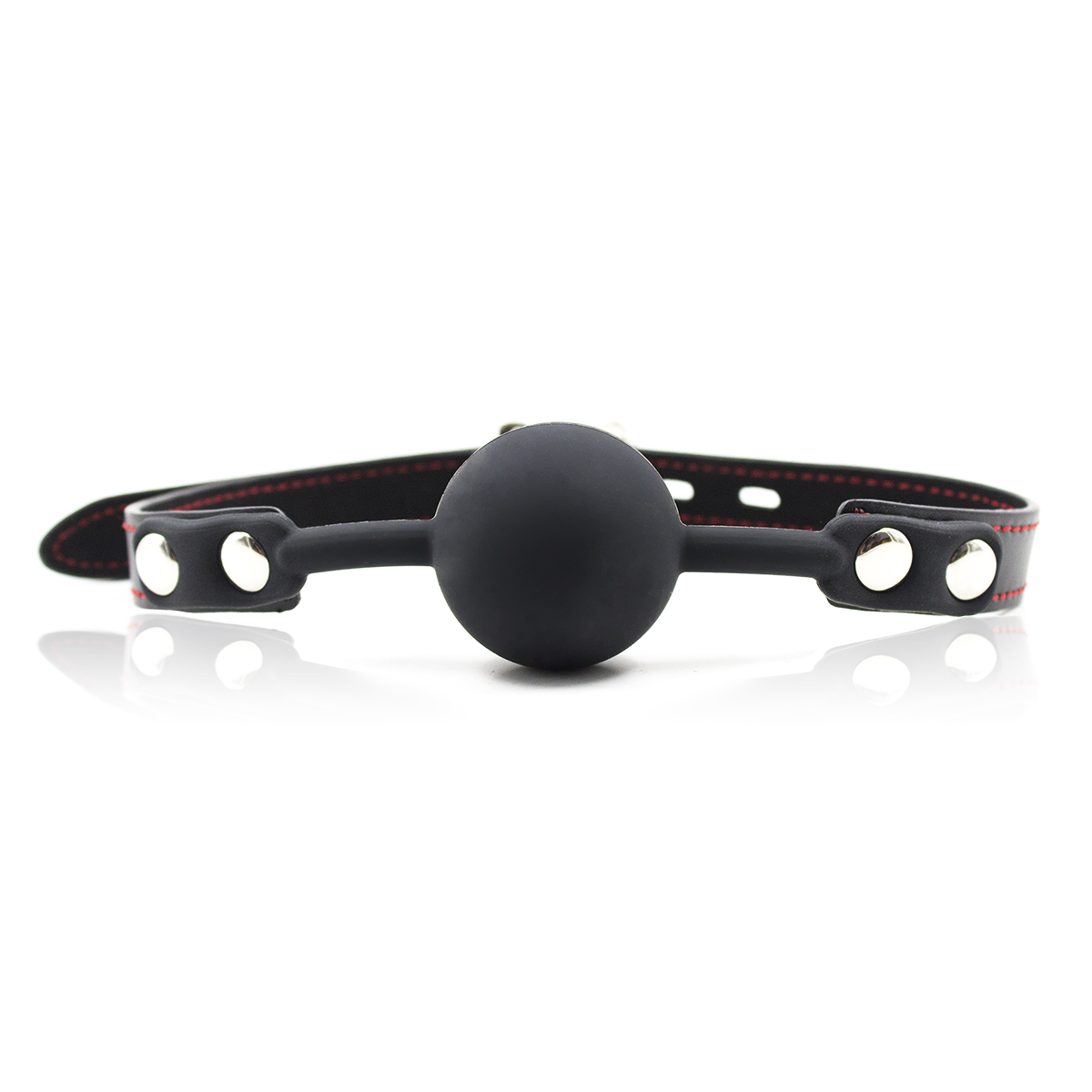 ЗакрытьСиликоновый кляп-шар на черном ремне с красной прострочкой