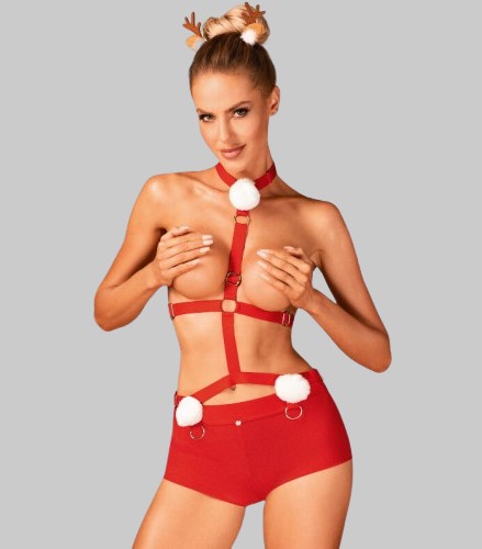 Соблазнительный крой и чрезвычайно пикантные элементы: переплетение стрепов, высокие трусики-шорты и заколочки на голову с милыми ушками - все это создаст игривый наряд в праздничной атмосфере.