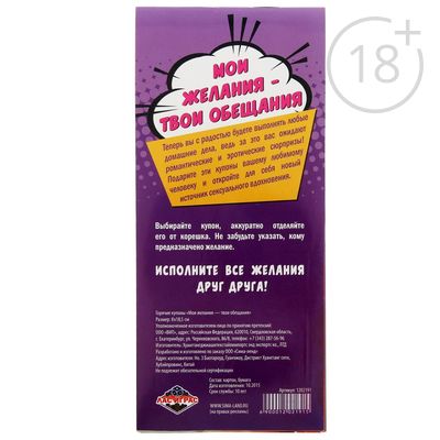 Исполните все желания друг друга вместе с игрой "Мои желания - твои обещания"! Выбираете купон, аккуратно отделите его от корешка, укажите кому предназначено желание и действуйте. Теперь можно с радостью будет выполнять любые домашние дела, ведь вас ожидают романтические и эротические сюрпризы!