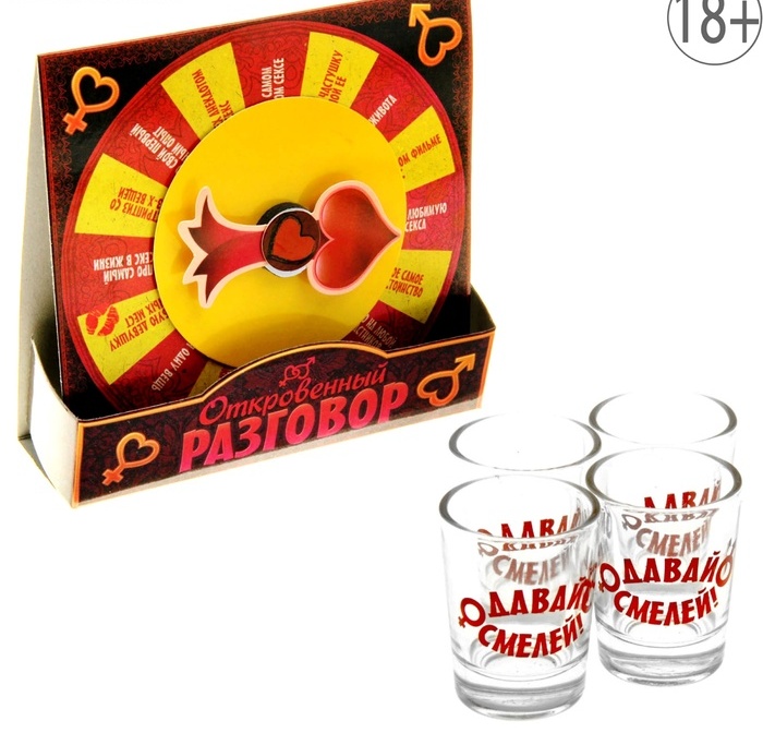 Немного откровений?.. Пьяная рулетка «Откровенный разговор» станет отличным поводом собраться вместе и весело, а главное раскрепощено провести время в компании друзей. Всё просто, запаситесь отличным настроением, алкоголем и желанием узнать друг о друге чуть больше. Играем, выпиваем Раскручивайте стрелку на рулетке и выполняйте задания. В комплекте к этой замечательной игре идут четыре рюмочки, так что комплект для вечеринки готов! Такая игра станет отличным подарком, а также развлечением для любого вечера в компании друзей, которые не привыкли скучать. Веселье гарантировано!