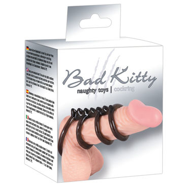 Bad Kitty Cockring – эрекционное кольцо с 4 кольцами значительно продлит половой акт, а также подарит незабываемые дополнительные ощущения. Кольца соединены между собой рельефным стимулятором. Насадка сделана из эластичного материла, благодаря чему очень легко надевается на пенис и мошонку. Рельеф сверху будет дополнительно стимулировать клитор партнерши, принося ей невероятно приятные ощущения.
