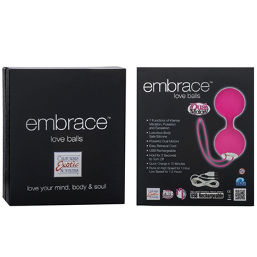California Exotic Embrace Love Balls – это небольшие по размеру вагинальные шарики, оснащенные функцией вибрации. Данная модель выполнена из гипоаллергенного медицинского силикона. Игрушка имеет два мощных моторчика, которые обеспечивают семь режимов вибрации, пульсации и эскалации. Девайс полностью водонепроницаем. Управление осуществляется при помощи одной сенсорной кнопки. Виброшарики оснащены встроенным аккумулятором, который полностью заряжается за 70 минут. Массажер способен работать один час на высокой скорости и полтора – на низкой. В комплект входит usb-шнур для зарядки.