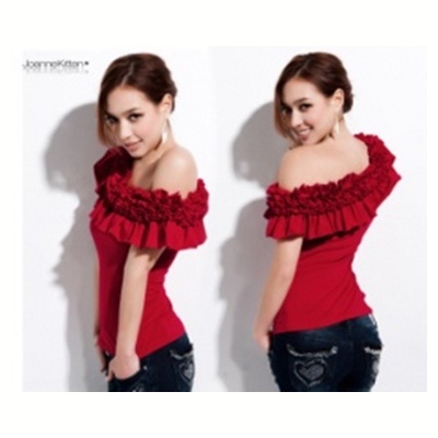 Просто и со вкусом! Пышные рюши делают майку похожей на приятную гвоздичку. Плечи голые, лопатки соблазнительно выглядывают из-под майки.