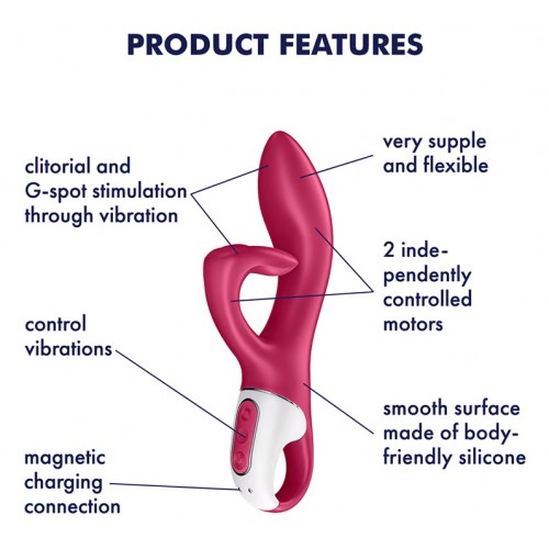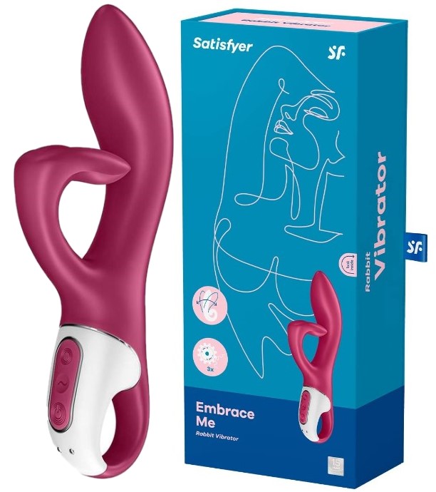 Satisfyer Embrace Me - это вибратор-кролик с 2 мощными моторчиками, которые одновременно стимулируют зону G и клитор. Имеет 12 режимов вибрации в каждом моторе, которые легко переключаются с помощью кнопок в основании вибратора. Режимы можно комбинировать между собой или управлять ими по отдельности. Основная часть имеет слегка загнутую форму и хорошо гнется, что позволяет эффективно стимулировать зону G. Вибратор изготовлен из гипоаллергенного безопасного силикона, имеет перезаряжаемый от USB аккумулятор и очень прост в уходе.