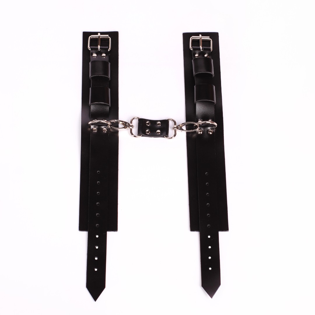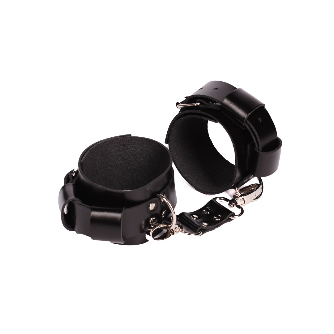 Наручники ручной работы из натуральной плотной кожи - необходимый аксессуар в любой БДСМ - игре. Соединена между собой небольшим металлическим карабином.
