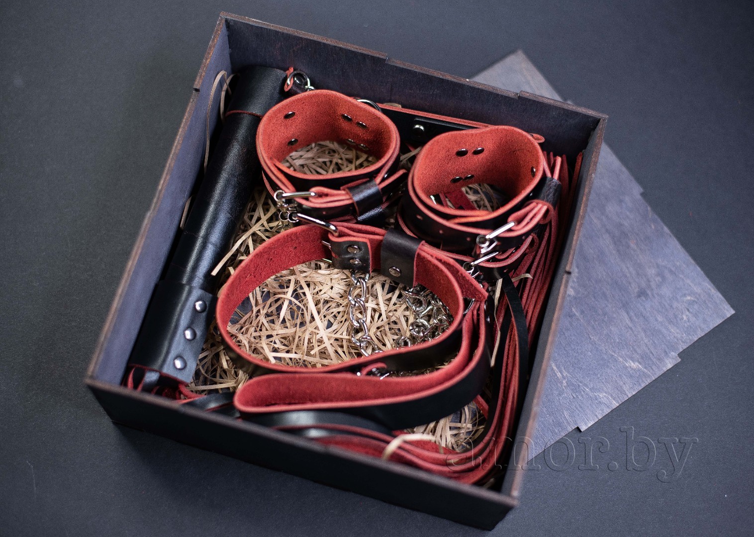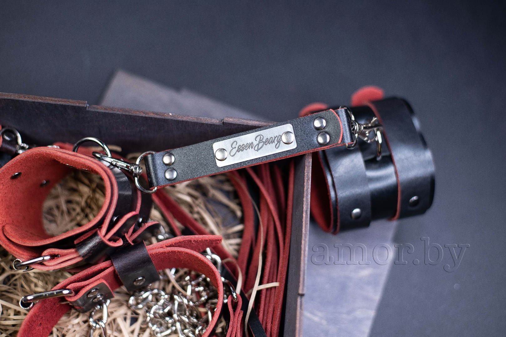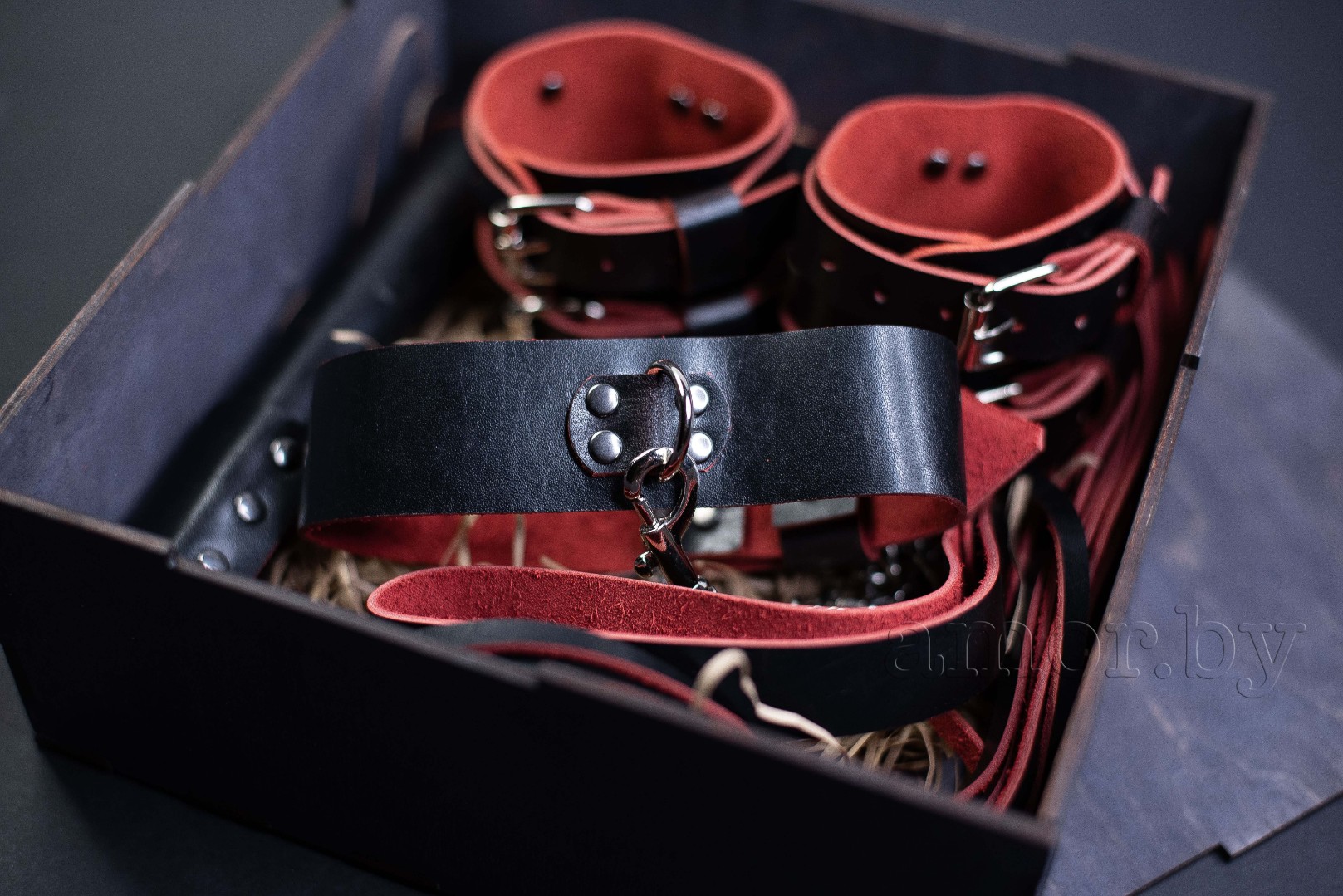 Данный набор состоит из кожаных наручников, ошейника с металлическим поводком и плети-флогера. Удобная ручка на рукоятке флогера делает использование комфортным и позволяет не убирать аксессуар во время игры. Общая длина плети 60 см.