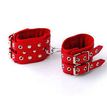 Кожаные красные наручники с карабином, с мягкой подкладкой