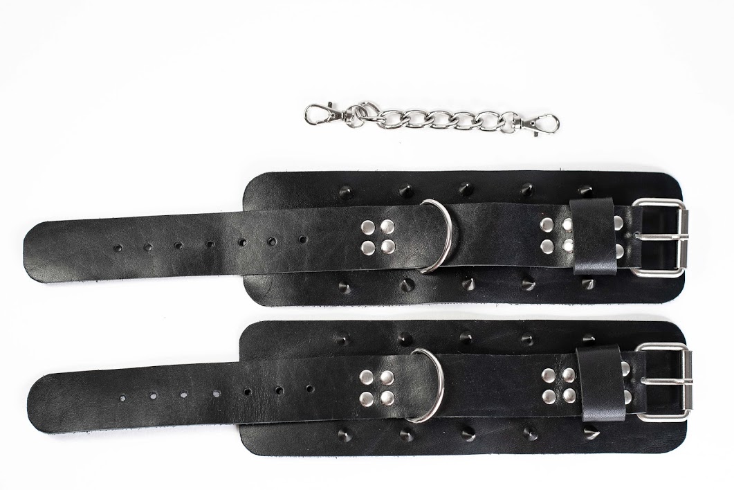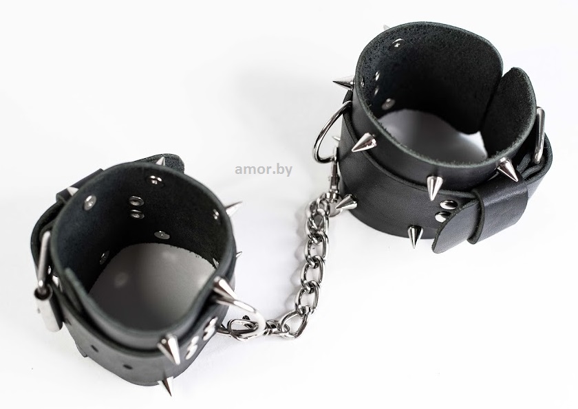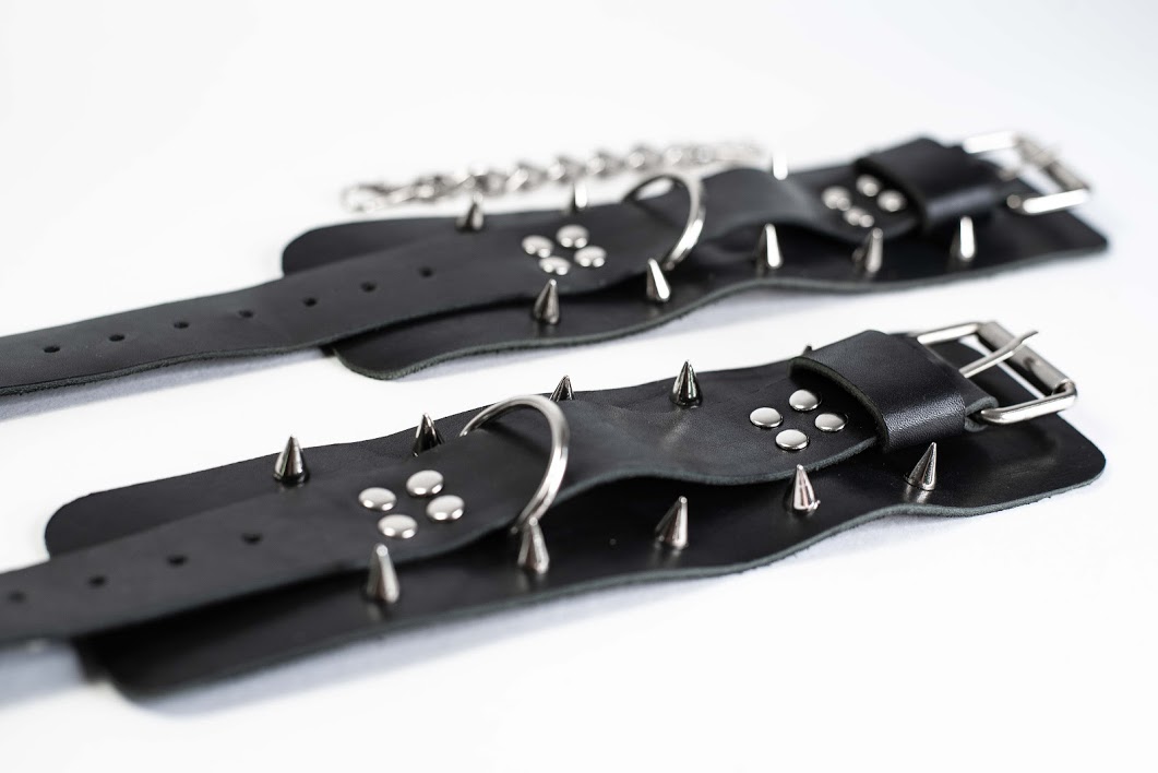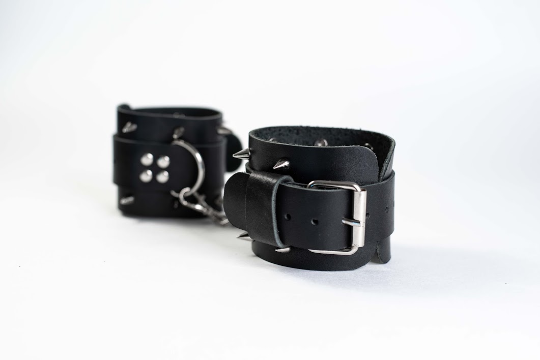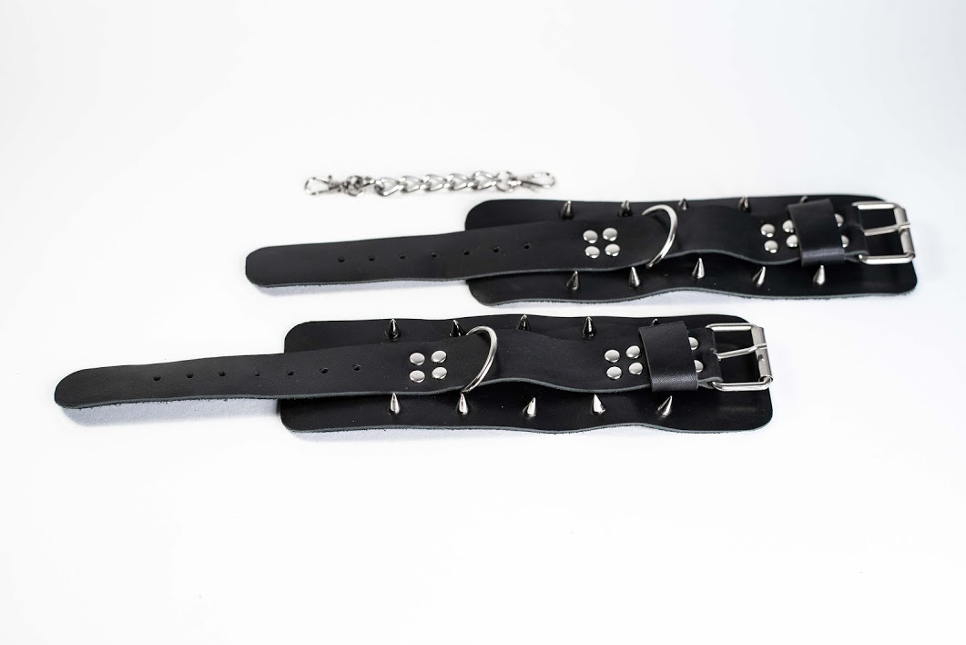 Наручники ручной работы из натуральной плотной кожи - необходимый аксессуар в любой БДСМ - игре. Соединены между собой металлической цепочкой с маленькими карабинами. Металлические шипы добавят брутальности аксессуару.