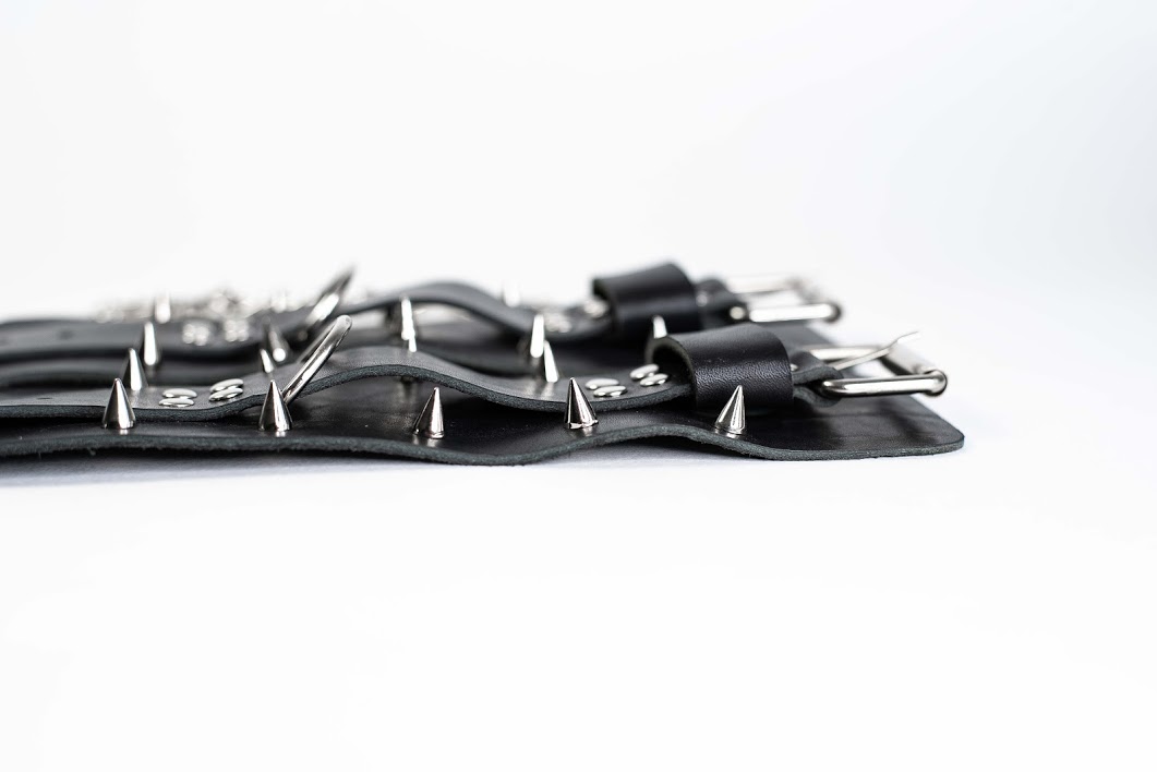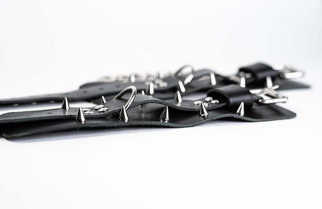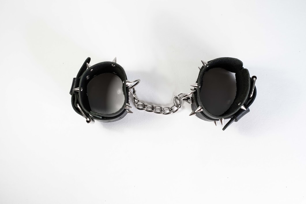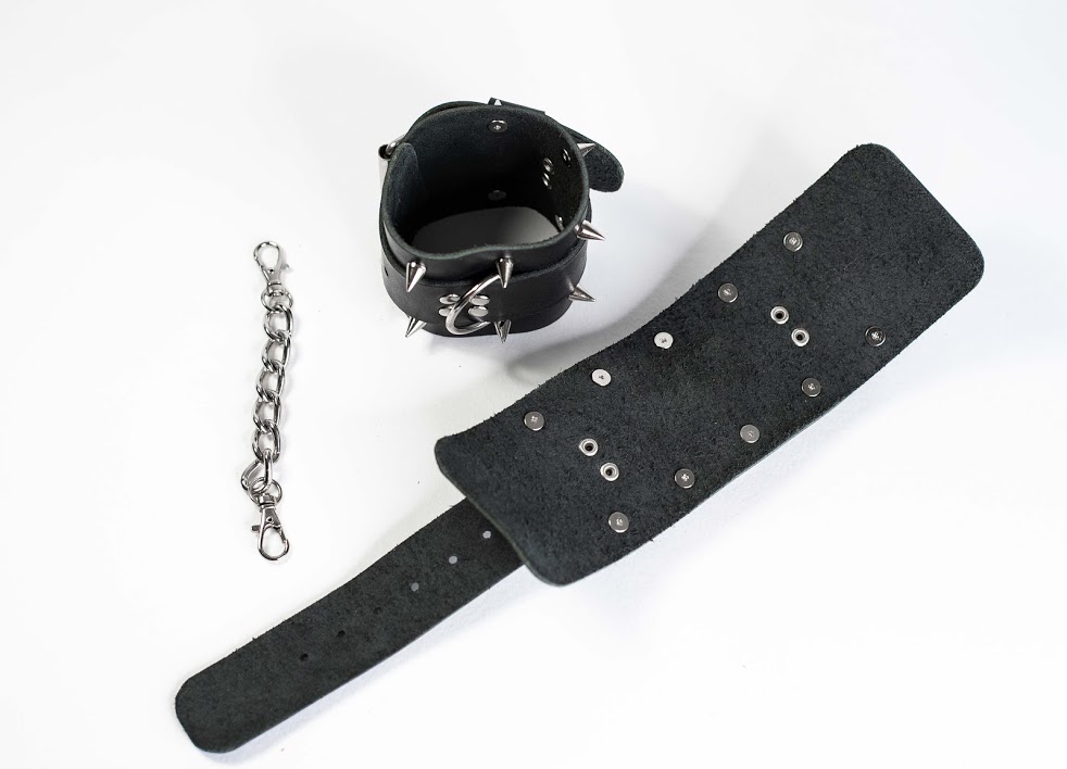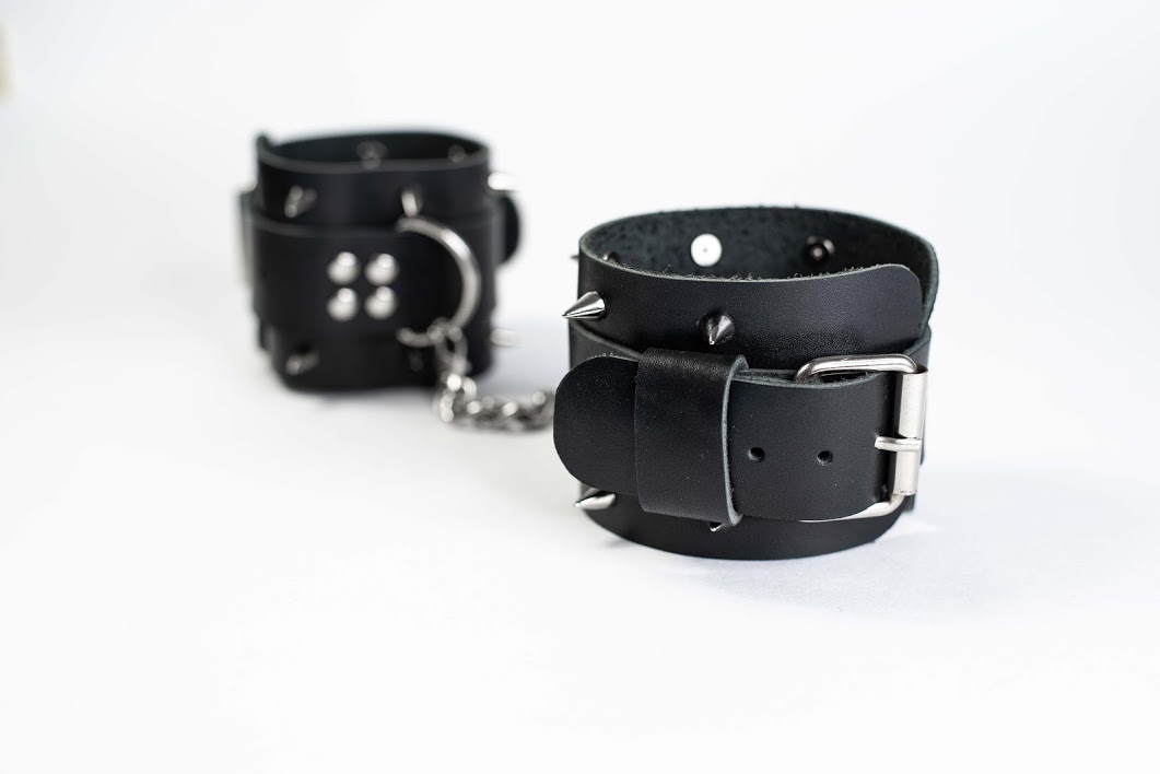 Наручники ручной работы из натуральной плотной кожи - необходимый аксессуар в любой БДСМ - игре. Соединены между собой металлической цепочкой с маленькими карабинами. Металлические шипы добавят брутальности аксессуару.
